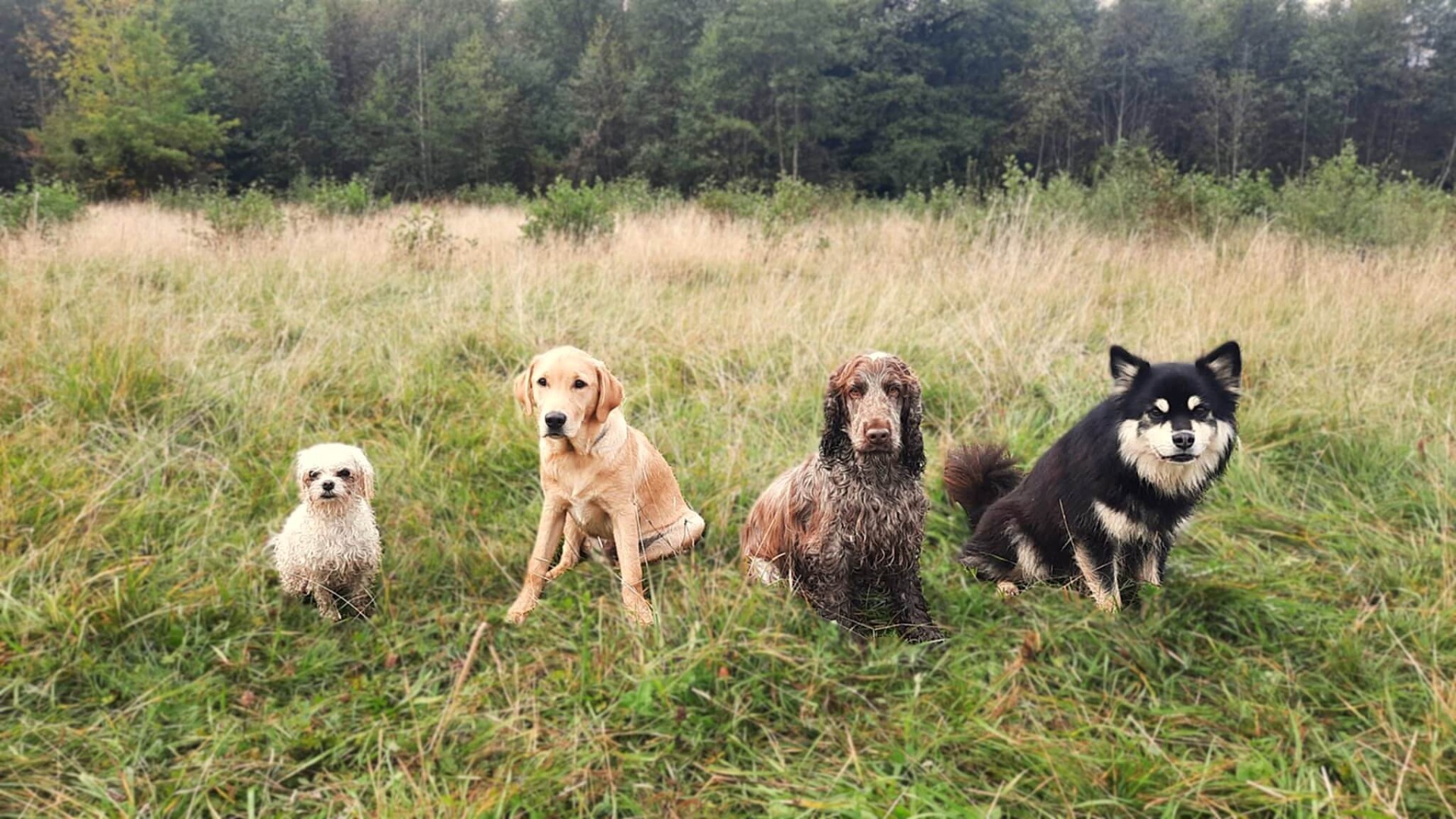 När hundarna kommer tar jag dem direkt på en 4 km lång flockpromenad. Ibland gör vi utflykter till en stor hage med blandad terräng som sträcker sig över cirka 8 hektar. Där får de chansen att springa fritt, utforska området och leka.